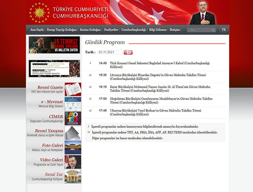 Cumhurbaşkanı Recep Tayyip Erdoğan, bugün Cumhurbaşkanlığı Külliyesi'nde Türk Konseyi Genel Sekreteri Baghdad Amreyev ile güven mektubu sunacak Litvanya Büyükelçisi Ricardas Degutis, Katar Büyükelçisi Mohamed Nasser Jassim M. Al Thani, Moğolistan Büyükelçisi Gombosuren Munkhbayar ve Ukrayna Büyükelçisi Vasyl Bodnar'ı ayrı ayrı kabul edecek.