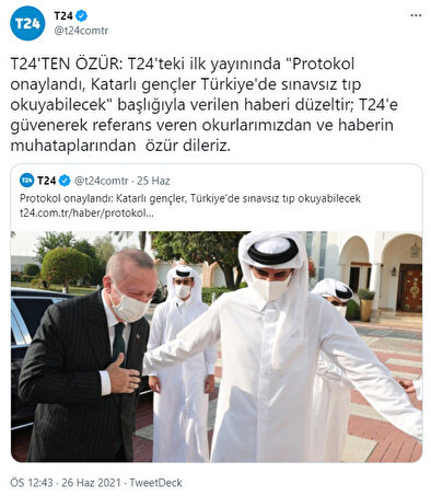 T24, "Protokol onaylandı, Katarlı gençler Türkiye'de sınavsız tıp okuyabilecek" başlığıyla verdiği haber için bugün özür metni yayımladı.