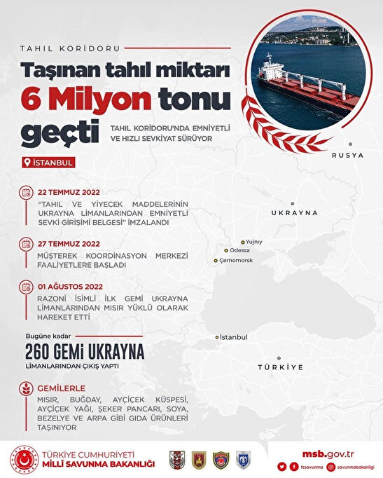 Milli Savunma Bakanlığı, tahıl sevkiyatı kapsamında Ukrayna limanlarından taşınan tahıl miktarı 6 milyon tonu geçtiğini duyurdu Ayrıca bugün 8 gemi daha Ukrayna limanlarından hareket etti.