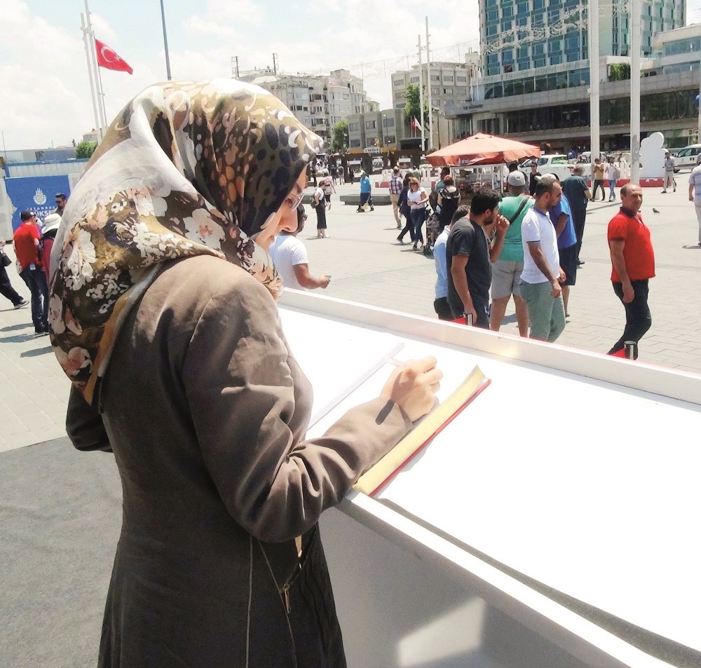 Kahraman şehidin heykeli, Taksim Meydanı’ndan geçenler tarafından büyük ilgi çekiyor. Vatandaşlar ve turistler, şehit Halisdemir’in heykeliyle fotoğraf çekiliyor. Öte yandan, platform önüne koyulan anı defterine de vatandaşlar düşüncelerini yazıyor. Küçük kızıyla birlikte anı defterini imzalayan Mustafa Demir, “Ülkemizin bu birlik ve beraberlik duyguları içerisinde, hangi milletten hangi kökenden olursa olsun, her türlü iç ve dış kuvvete karşı her zaman birlik ve beraberlik içerisinde mücadele edeceğimizin göstergesidir 15 Temmuz” dedi.