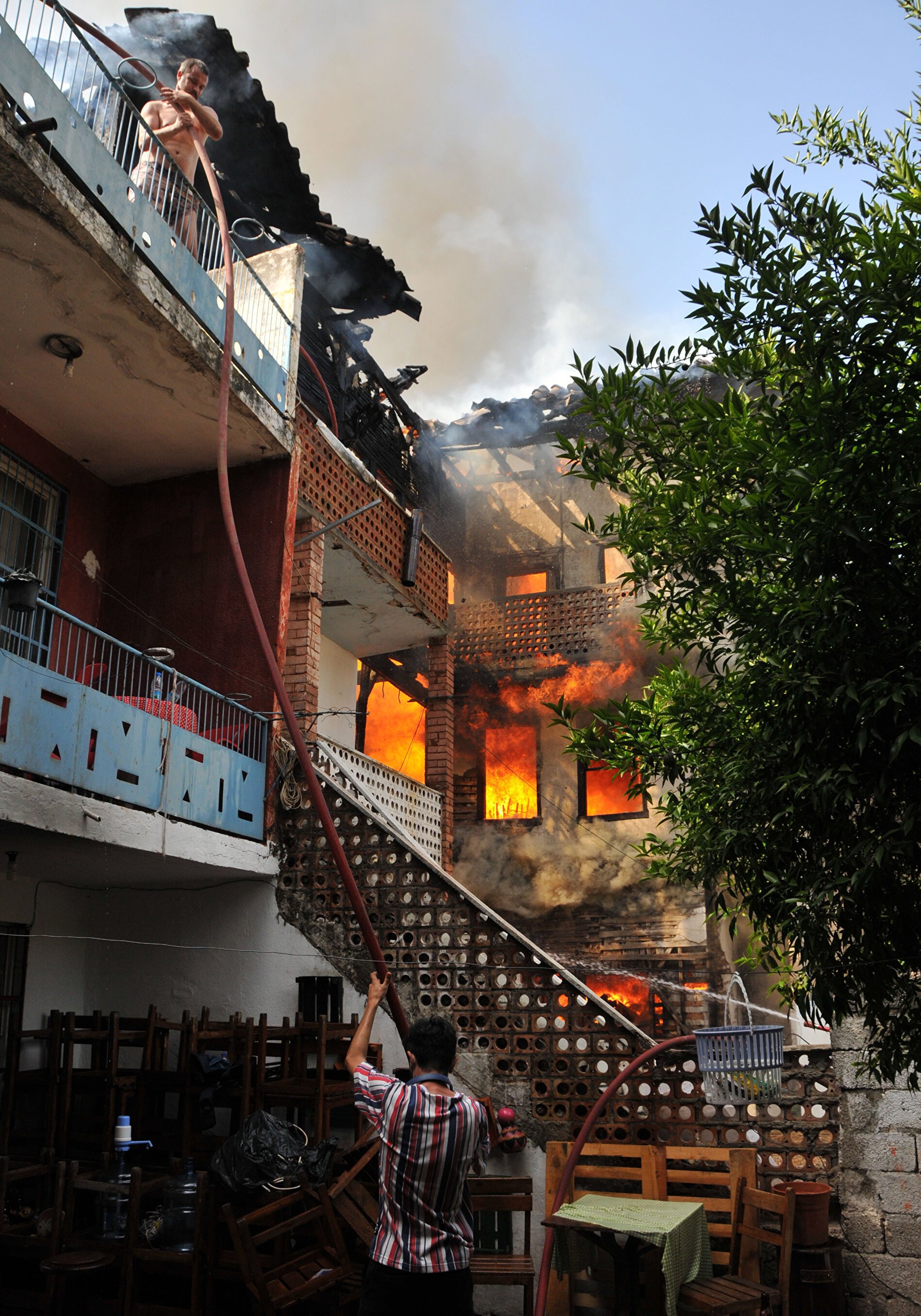 Muratpaşa ilçesine bağlı Kılıçaslan Mahallesi Hamam Sokak'taki 3 katlı tarihi ahşap binada, pazar günü saat 16.00 sıralarında, yangın çıktı. Otel ve restoranların yoğunlukta olduğu sokaktaki yangını görenler, itfaiyeye haber verdi. Binanın bitişiğindeki otel ve evlerin sahipleri, alevlerin sıçraması ihtimaline karşı hortumlarla müdahale etti. Dar sokaklardan güçlükle ulaşan itfaiye ekiplerinin çalışması ile yangın güçlükle söndürüldü.