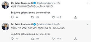Türkiye, yurdun dört bir yanındaki orman yangınlarıyla boğuşuyor. Tarım ve Orman Bakanı Bekir Pakdemirli, söndürme çalışmaları süren yangınlardan ikisinin daha kontrol altına alındığını açıkladı. Twitter hesabından duyuru yapan Bakan, "Kütahya Emet ve Kilis yangınları kontrol altına alındı" dedi.