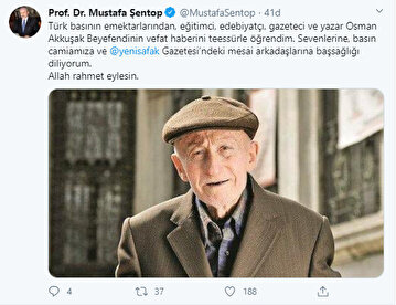 Türkiye Büyük Millet Meclisi (TBMM) Başkanı Mustafa Şentop, tedavi gördüğü hastaneden hayatını kaybeden Yeni Şafak’ın emektar isimlerinden usta gazeteci Osman Akkuşak için sosyal medyadan başsağlığı mesajı yayımladı. Twitter hesabından paylaşımda bulunan Şentop, "Türk basının emektarlarından, eğitimci, edebiyatçı, gazeteci ve yazar Osman Akkuşak Beyefendinin vefat haberini teessürle öğrendim. Sevenlerine, basın camiamıza ve Yeni Şafak gazetesindeki mesai arkadaşlarına başsağlığı diliyorum. Allah rahmet eylesin." ifadelerini kullandı.