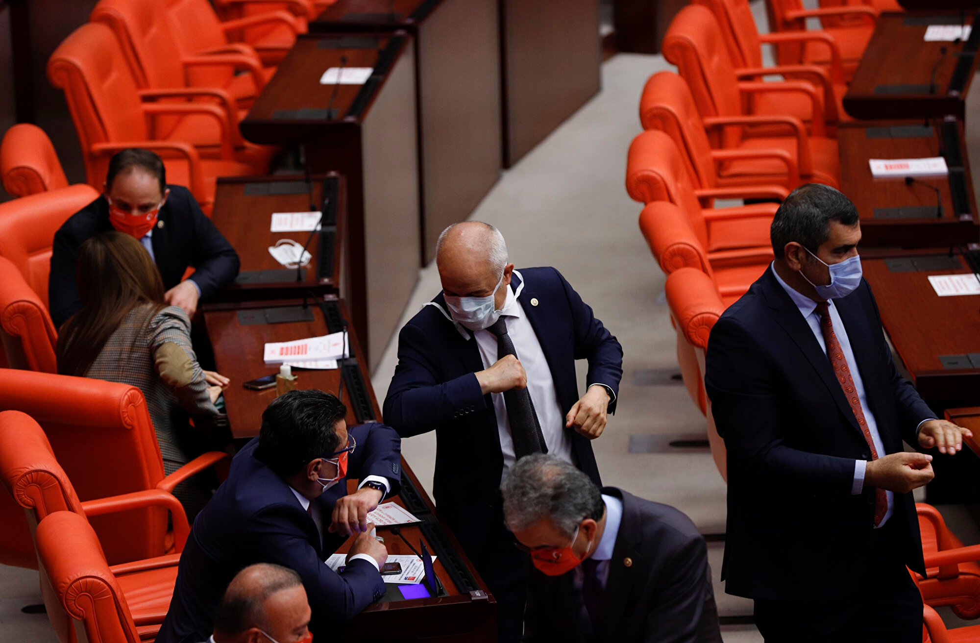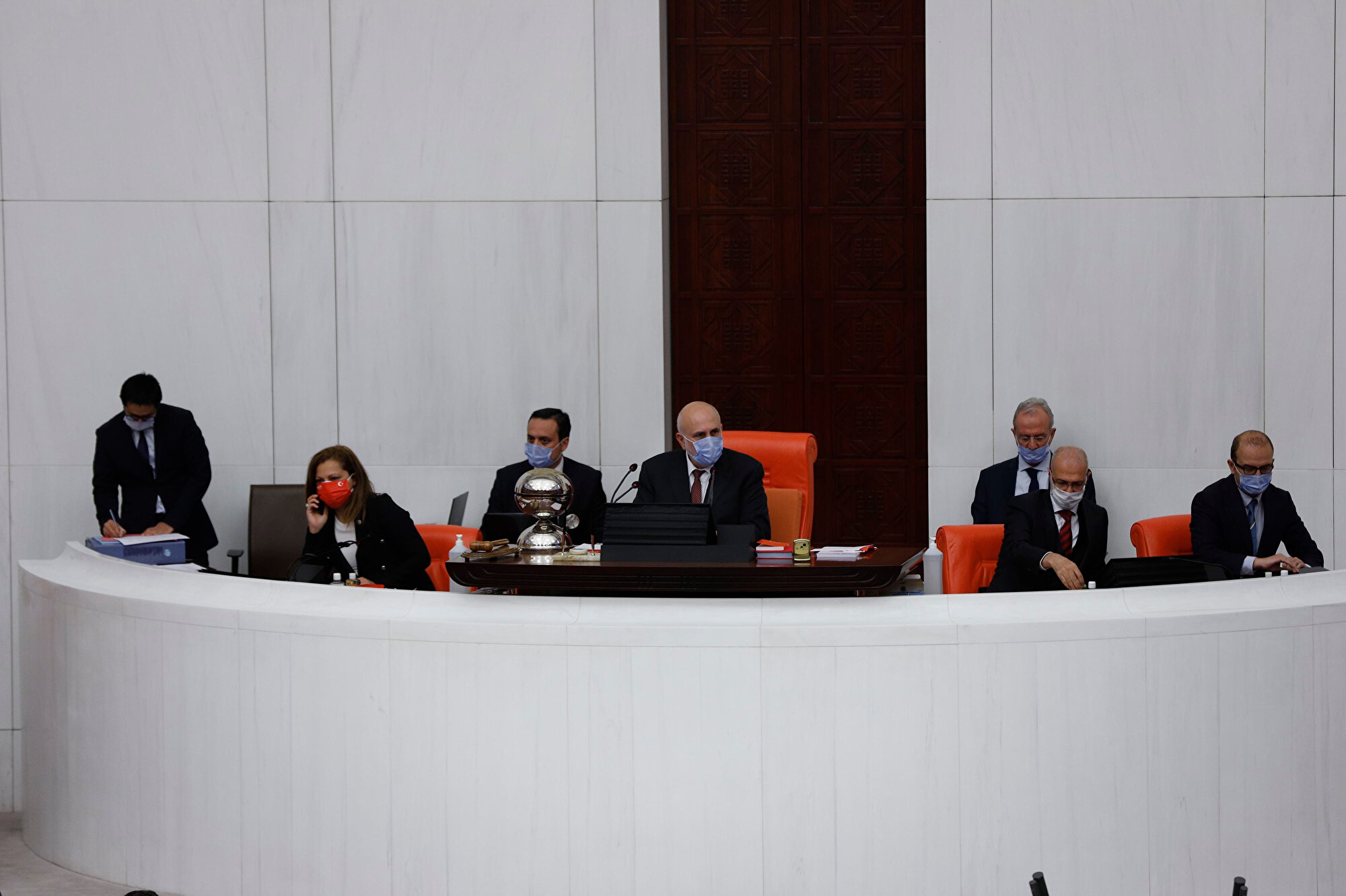 Bu arada 16 Nisan'da verilen aranın ardından yeniden bugün açılan Meclis'te yeni koronavirüs (Kovid-19) ile mücadele kapsamında alınan tedbirler doğrultusunda Genel Kurul Salonu'nda bulunan milletvekilleri, Meclis çalışanları ve gazeteciler maske takıyor. Milletvekilleri sıraları sosyal mesafe kuralı gereği birer koltuk boş bırakılarak düzenlenirken, milletvekilleri yerlerinden ve kürsüden maskelerini çıkarmadan konuşuyor.