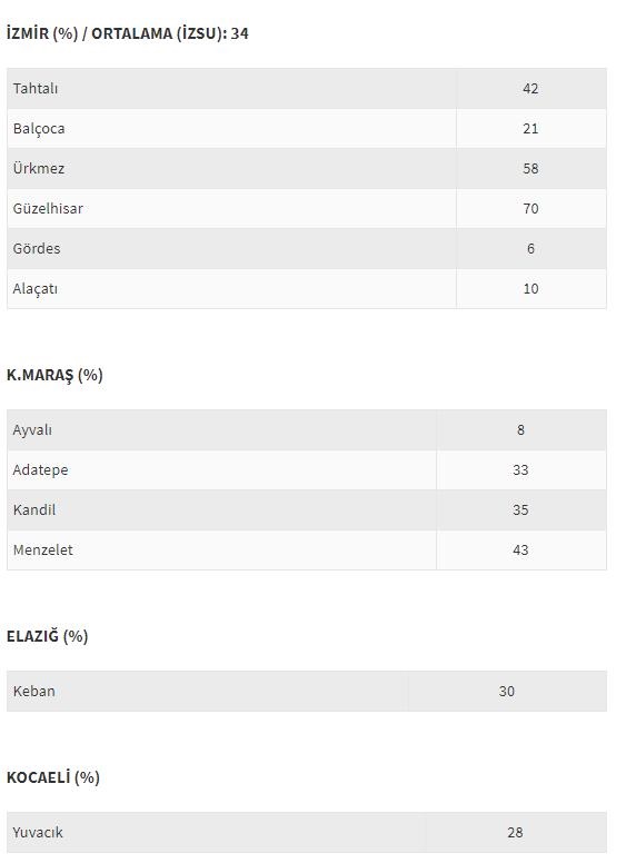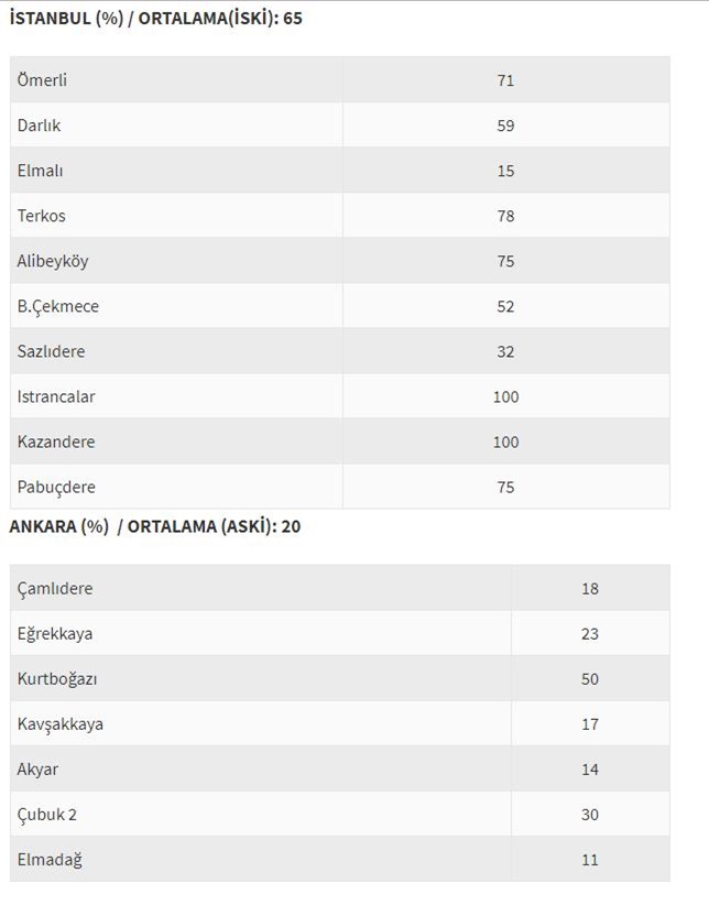 Gazete Habertürk'ün haberine göre İstanbul’a su sağlayan Ömerli, Terkos, Darlık, Büyükçekmece, Alibey, Istrancalar, Sazlıdere, Kazandere, Elmalı ve Pabuçdere barajlarındaki toplam doluluk oranı yüzde 65’e kadar düştü.