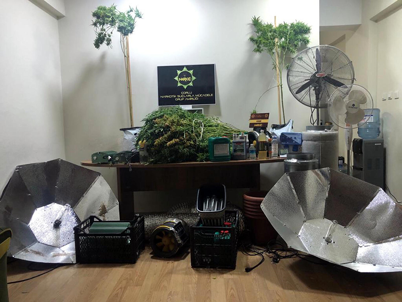 Tekirdağ'ın Çerkezköy ilçesinde polis ekipleri, ısı ve havalandırma sistemiyle uyuşturucu yetiştirilen eve operasyon düzenledi. Operasyonda saksı ve poşetlerde yetiştirilen uyuşturucular ele geçirilirken, iki kişi gözaltına alındı.
