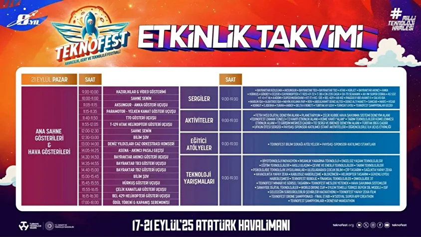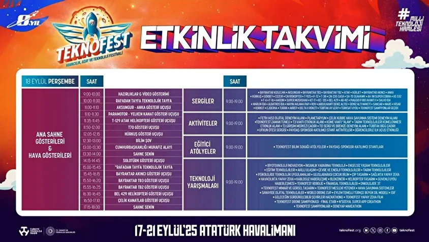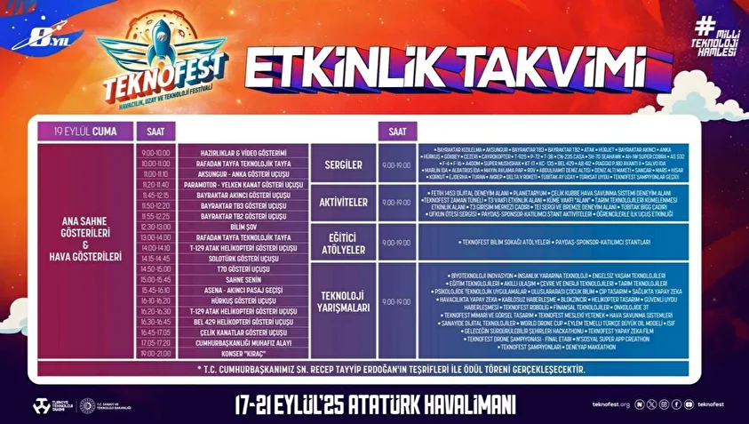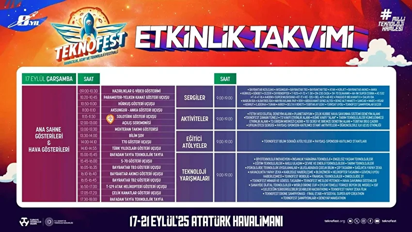 Etkinlikte ayrıca ATAK helikopterleri, Hürkuş, ANKA, Bayraktar TB2, Bayraktar TB3 ve Bayraktar AKINCI yer alıyor. 21 Eylül'de sona erecek olan festivalde, ziyaretler 09.00-19.00 saatleri arasında yapılacak.