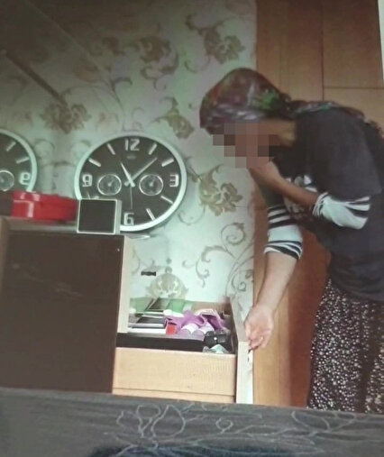 Eve gelen kadın, temizlik yaptığı odanın çekmecelerini açıp karıştırmaya başladı. Kendisini kaydeden kameradan habersiz olan kadın, çekmecede bulduğu paraları alıp cebine koydu.