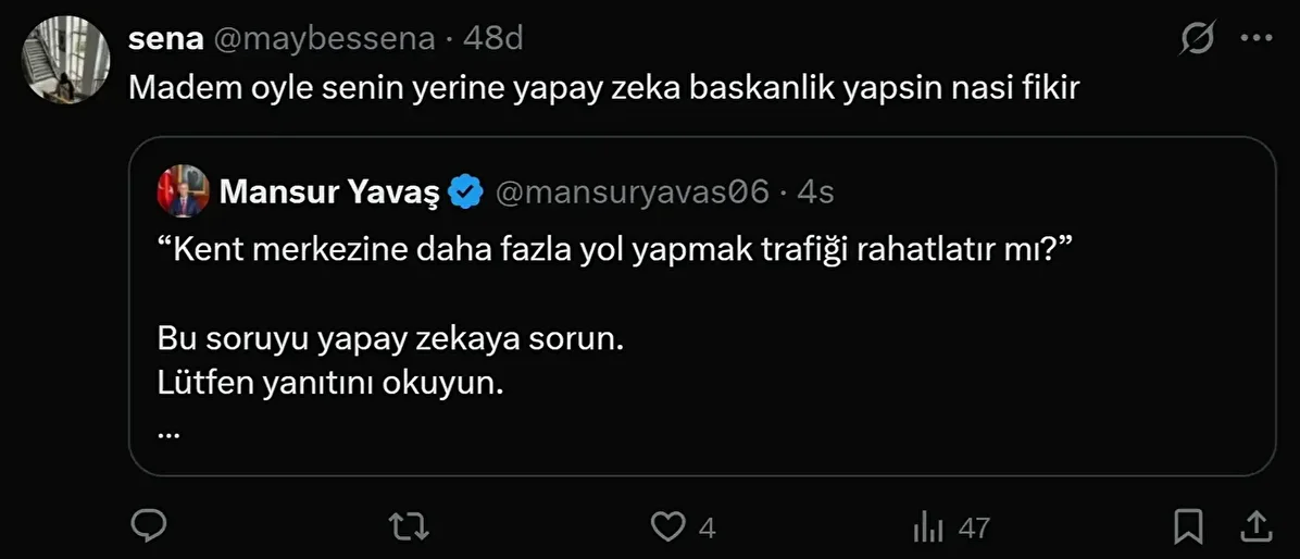 Ankara'daki trafik sorununa çözüm üretemediği için tepkilerin odağı haline gelen Ankara Büyükşehir Belediye Başkanı Mansur Yavaş, kendisini 'yapay zekâ' ile savundu. Hemen her fırsatta şehir merkezine yol yapmanın trafiği daha da artıracağını iddia eden Yavaş, "Bu soruyu yapay zekâya sorun, yanıtı okuyun" dese de vatandaş hâlâ tepkili... Somut bir adım göremeyen Ankaralılar, Yavaş'a tepkisini, "O zaman bırakın ChatGPT yönetsin belediyeyi Mansur Bey" ifadeleriyle dile getiriyor.
