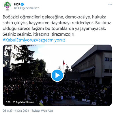 HDP'nin resmi sosyal medya hesabından, Boğaziçi Üniversitesi’ndeki eylemlere destek paylaşımı yapıldı. Mesajda, “Boğaziçi öğrencileri geleceğine, demokrasiye, hukuka sahip çıkıyor, kayyımı ve dayatmayı reddediyor. Bu itiraz olduğu sürece faşizm bu topraklarda yaşayamayacak. Sesiniz sesimiz, itirazınız itirazımızdır” denildi.