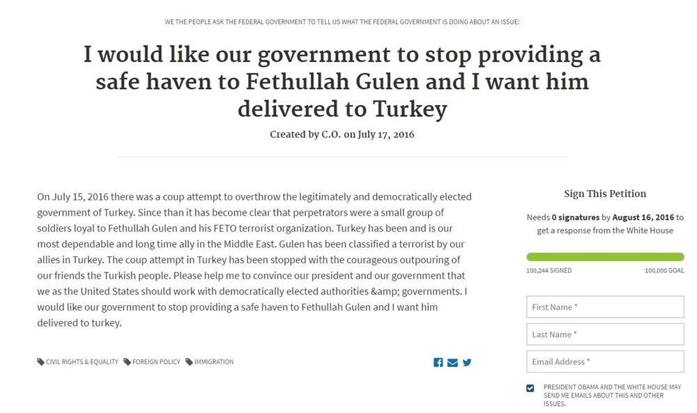 FETÖ'nün elebaşı Fetullah Gülen'in Türkiye'ye iadesi için Beyaz Saray'ın resmi internet sitesinde başlatılan kampanyada hedeflenen 100 bin imzaya ulaşıldı.