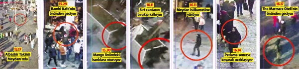 - Beyoğlu’ndaki bombalı saldırıyı gerçekleştiren terörist Alham Albashir’in patlamadan önce olay yerine gelişi ve patlamanın ardından uzaklaştığı anlara ilişkin görüntüler de ortaya çıktı. Görüntülerde, olay günü saat 15.17’de Taksim Meydanı tarafından İstiklal Caddesi’ne giren teröristin, sırt çantası ve elindeki bir poşetle caddede yürüdüğü görülüyor. Başörtüsü ile eşkalini gizlemeye çalışan ve saat 15.29’da bir kafenin önüne gelen teröristin saat 15.30’da bir mağazanın önünde yer alan ve patlamanın gerçekleştiği noktadaki banka, çantası ve elindeki poşetle oturması dikkati çekiyor. Görüntülerde, yaklaşık 41 dakika bankta oturan Albashir’in, saat 16.11’de sırt çantasını bankta bırakarak yine Taksim Meydanı istikametine yürümeye başladığı, patlamanın gerçekleştiği an olan saat 16.14’ten sonra ise koşmaya başladığı anlar yer alıyor. Teröristin daha sonra ulaştığı Taksim Meydanı’nda saat 16.17 sıralarında bir otelin önünde yürüdüğü anlar da kayıt altına alındı.