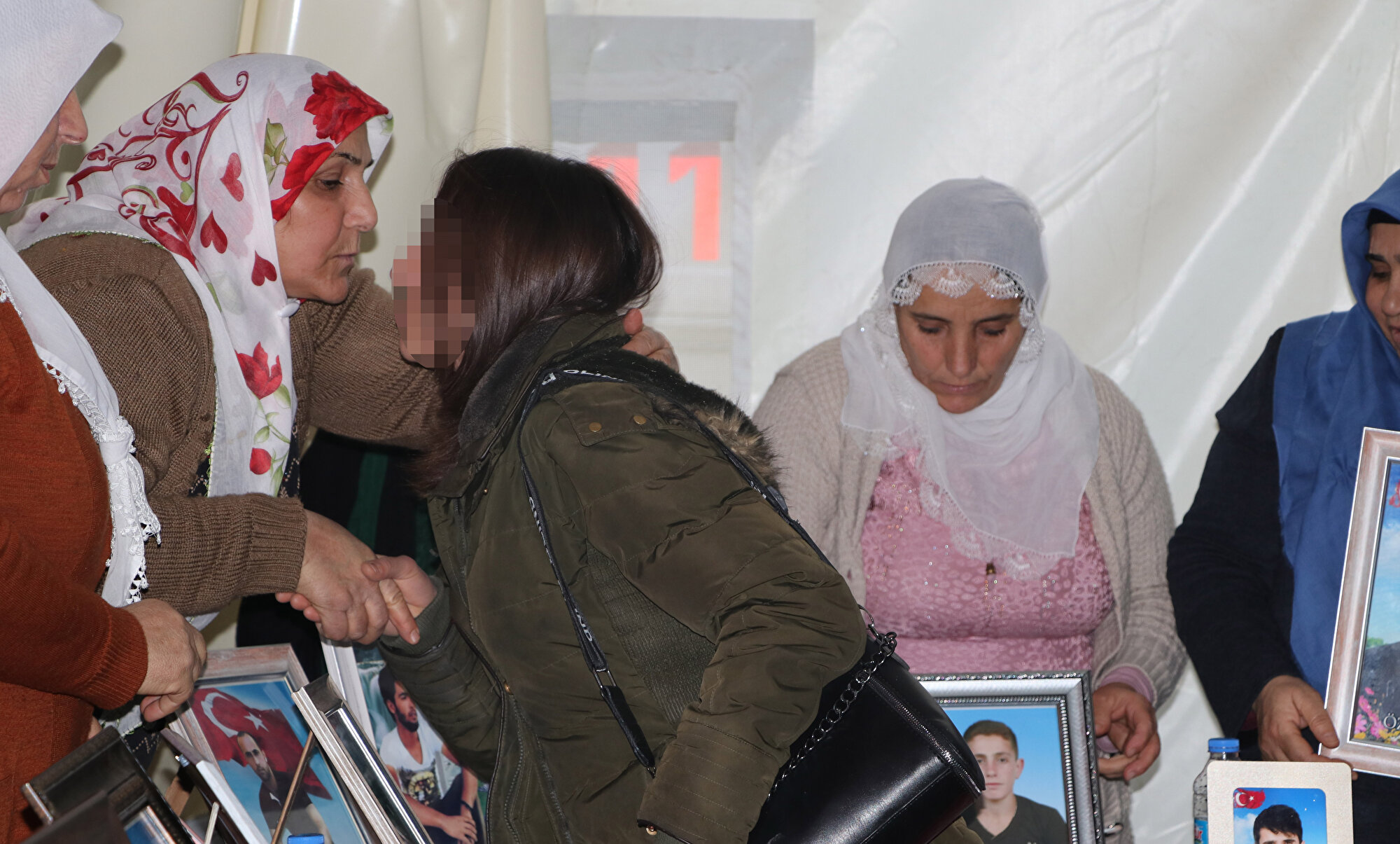 Terör örgütü PKK tarafından kaçırılan çocuklarının bulunması için 158 gündür HDP Diyarbakır İl Başkanlığı binası önünde oturma eylemini yapan aileleri, 9 ay önce Hakkari'de terör örgütünün elinden kaçıp güvenlik güçlerine teslim olan ve eylemelere katılmadığı için ailesine teslim edilen F.T. ziyaret etti.
