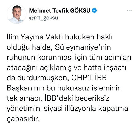"İlim Yayma Vakfı hukuken haklı olduğu halde, Süleymaniye'nin ruhunun korunması için tüm adımları atacağını açıklamış ve hatta inşaatı da durdurmuşken, CHP'li İBB Başkanının bu hukuksuz işleminin tek amacı, İBB'deki beceriksiz yönetimini siyasi illüzyonla kapatma çabasıdır."