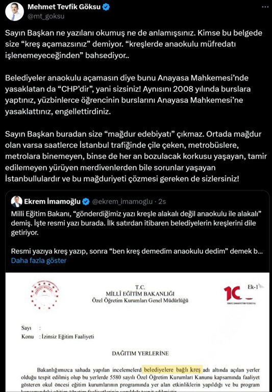 "Sayın Başkan ne yazılanı okumuş ne de anlamışsınız. Kimse bu belgede size “kreş açamazsınız” demiyor. “Kreşlerde anaokulu müfredatı işlenemeyeceğinden” bahsediyor.."