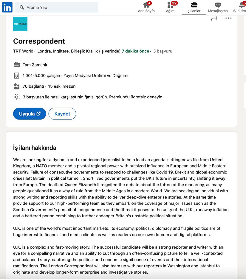 TRT World ilanında herhangi bir siyasi lideri hedef almadan “Ard arda gelen Britanya hükümetlerinin Kovid-19 salgını, Brexit, küresel ekonomik kriz gibi büyük meydan okumalara yanıt vermekte başarısız olması İngiliz siyasetini bir karmaşa içine soktu. Kısa süreli İngiliz hükümetleri ülkenin geleceğini belirsizlik içinde bırakıyor ve İngiltere’yi Avrupa’dan uzaklaştırıyor. Kraliçe Elizabeth’in ölümüyle birlikte, Orta Çağ’dan kalma bir yönetim biçimi olarak Kraliyet’in modern çağda varlığı tartışmaları hız kazandı. Bu konularda kapsamlı haberler yapabilecek, kalemi kuvvetli muhabirlere ihtiyacımız var” denildi.