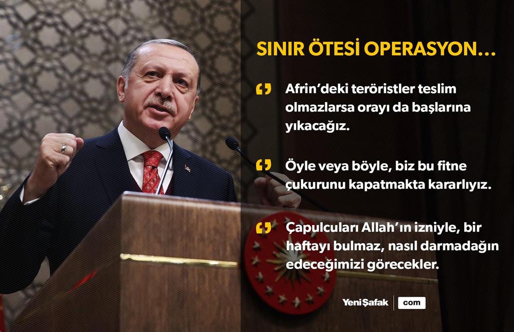 Erdoğan, "İdlib operasyonuyla bu koridorun batı kanadını çökertiyoruz. Afrin'deki teröristler teslim olmazlarsa orayı da başlarına yıkacağız, bu böyle biline." diye konuşmuştu.