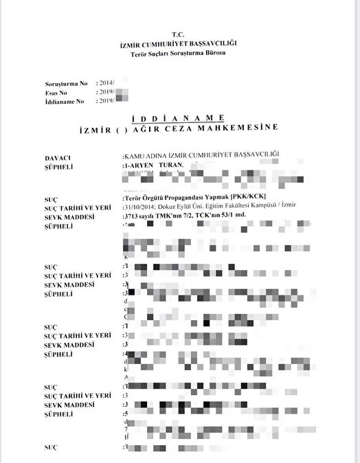 İzmir Barosu Olağan Genel Kurul toplantısında 'Türk Silahlı Kuvvetlerinin terörle mücadele operasyonlarında kimyasal silah kullandığını' iddia eden avukat Aryen Turan hakkında İzmir Cumhuriyet Başsavcılığınca soruşturma açılmıştı. TSK'ya iftira atan Turan hakkında geçtiğimiz yıllarda PKK propagandası yapmak suçundan iddianame hazırlandığı ortaya çıktı.