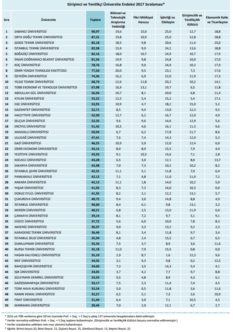 TÜBİTAK'ın belirlediği en yenilikçi ve girişimci 50 üniversite açıklandı. Lisede birinci sırada Sabancı Üniversitesi, ikinci sırada Orta Doğu Teknik Üniversitesi, üçüncü sırada ise Gebze Teknik Üniversitesi yer aldı. Bu sıralamayı İstanbul Teknik Üniversitesi ve Boğaziçi Üniversitesi takip etti.