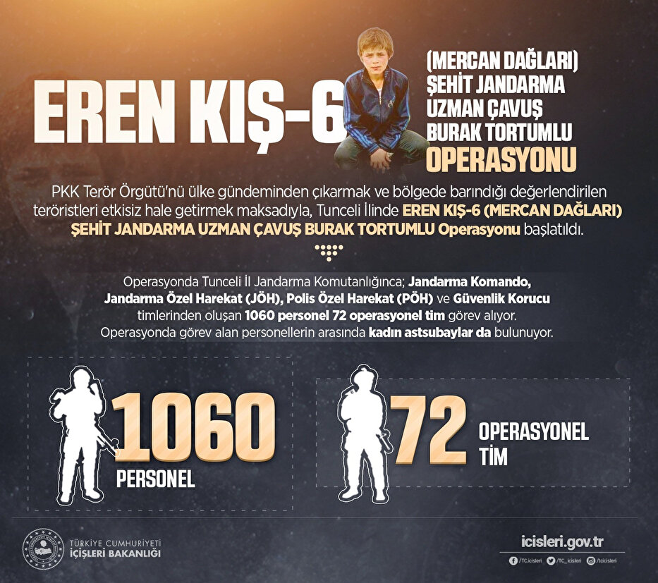 İçişleri Bakanlığından yapılan açıklamada, terör örgütü PKK'yı ülke gündeminden çıkarmak ve bölgede barındığı değerlendirilen teröristleri etkisiz hale getirmek amacıyla Tunceli'de "Eren Kış-6 (Mercan Dağları) Şehit Jandarma Uzman Çavuş Burak Tortumlu Operasyonu"nun başlatıldığı kaydedildi.