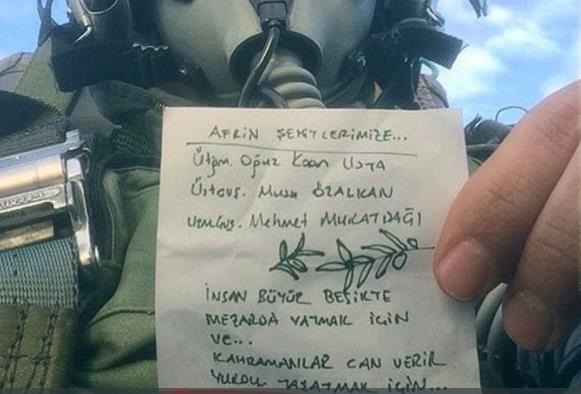 Savaş pilotunun fotoğraflı mesajında yer alan not kağıdında Afrin şehitlerinin ismini yazıp "İnsan büyür beşikte mezarda yatmak için... Kahramanlar can verir yurdu yaşatmak için..." sözleri yer aldı.