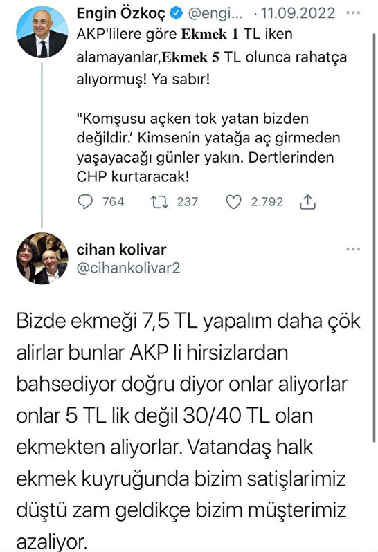 Katıldığı televizyon programında "Ekmek aptal toplumların temel gıda maddesidir. Bizim toplum ekmek ile doyduğu için başında 20 senedir böyle yöneticiler duruyor" şeklinde skandal açıklamalara imza atan Ekmek Üreticileri Sendikası Başkanı Cihan Kolivar'ın sosyal medya paylaşımları ortaya çıktı. CHP'li isimlerin tweetlerini paylaşan Kolivar'ın AK Parti seçmenine karşı aşağılayıcı ifadeler kullandığı görüldü.