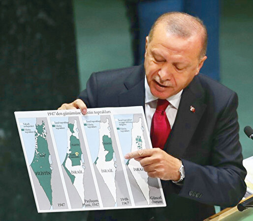 Ben şimdi Netanyahu’yu muhatap alırsam bu bizi küçültmez mi? Netanyahu şu anda başının çaresine bakıyor. Durum zaten pek hayra alamet değil. Çok rahatsız oluyor. Çünkü bu harita onları çıldırtıyor. İşin gerçeği ABD’de Yahudi kuruluş temsilcileriyle bir görüşme yaptık. Orada kendilerine dedim ki “Siz işgalcisiniz. 1947-1948’de siz neredeydiniz?” Onlara haritayı gösterdik ve dedik ki “Bak siz buradaydınız, bundan sonra Filistin küçüldü, siz büyüdünüz. Ne ile? İşgal ile… 1967 buradaydınız. Şimdi ise İsrail 1947-1948’deki Filistin’in büyüklüğüne kavuştu. Filistin ise maalesef o zamanki İsrail’in durumuna düştü.” Ortada böyle bir tablo var.