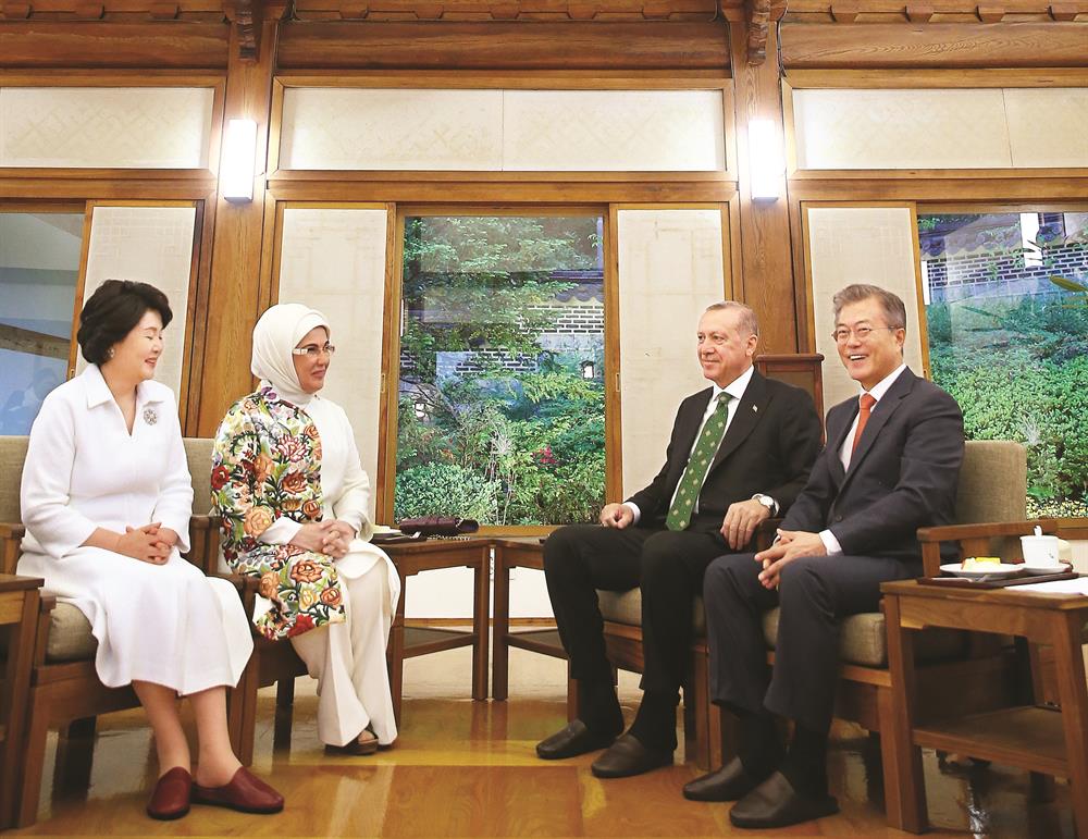 Cumhurbaşkanı Recep Tayyip Erdoğan, Güney Kore Cumhurbaşkanı Moon Jae-in tarafından resmi törenle karşılandı. "Mavi Ev" olarak bilinen Cumhurbaşkanlığı Sarayı'ndaki karşılama töreninin yapıldığı salona Cumhurbaşkanı Erdoğan ve eşi Emine Erdoğan, Güney Kore Cumhurbaşkanı Moon ve eşi Kim Jung-sook ile geldi. Ardından heyetler arası görüşmelere başkanlık eden iki lider, toplantının basına açık kısmında konuştu.