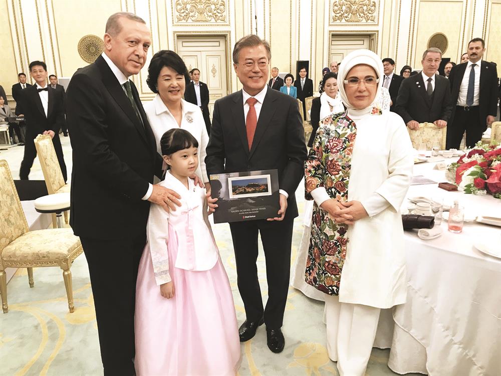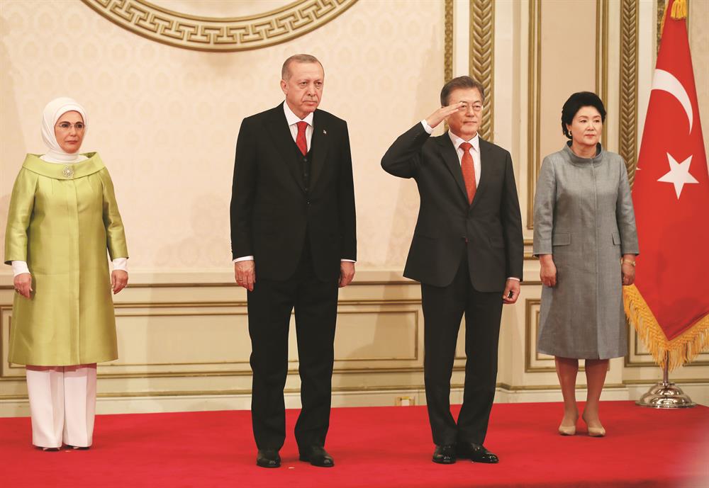 Güney Kore’de “Mavi Ev” olarak bilinen Cumhurbaşkanlığı Sarayı’ndaki karşılama töreninin yapıldığı salona Cumhurbaşkanı Erdoğan ve eşi Emine Erdoğan, Güney Kore Cumhurbaşkanı Moon ve eşi Kim Jung-sook ile geldi. Erdoğan ile Moon tören kıtasını selamladıktan sonra, eşleriyle beraber tören alanındaki yerlerini almalarının ardından Türkiye ve Güney Kore milli marşları çalındı. Güney Kore Cumhurbaşkanı Moon’un, İstiklal Marşı okunduğu sırada asker selamı vermesi dikkat çekti.