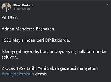 Sosyal medya hesabında kendi partisinin idam ettirdiği Adnan Menderes dönemini işaret eden CHP’li Hüsnü Bozkurt, “Yıl 1957. Adnan Menderes Başbakan. 1950 Mayıs’ından beri DP iktidarda. İşler iyi gitmiyor, dış borçlar boyu aşmış, halk burnundan soluyor... 2 Ocak 1957 tarihli Yeni Sabah gazetesi manşetten #mujdelerolsun demiş. “Trakya’da zengin petrol bulundu!” 63 yıl önce, 63 yıl sonra...” dedi.