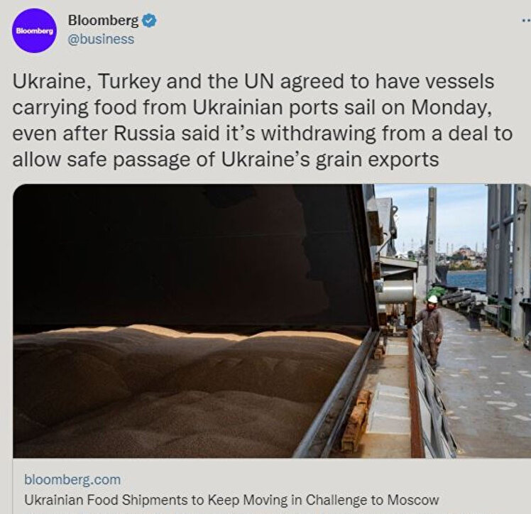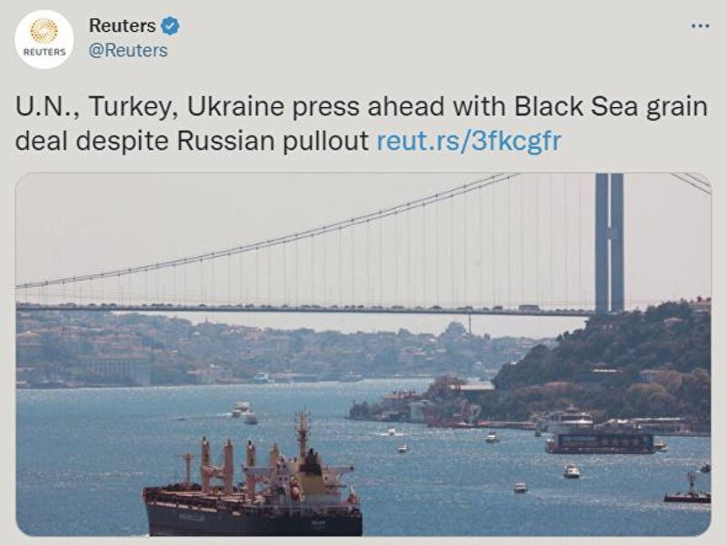 "Açıklama, gemi hareketlerinin yeniden başlayacağı konusunda bilgilendirilen Rus delegelerin de dahil olduğu bir dizi görüşmenin ardından geldi. Türkiye ve BM, Ukrayna limanlarından tahıl sevkiyatları için güvenli geçiş anlaşmasına aracılık etmek için aylarca çalıştı.