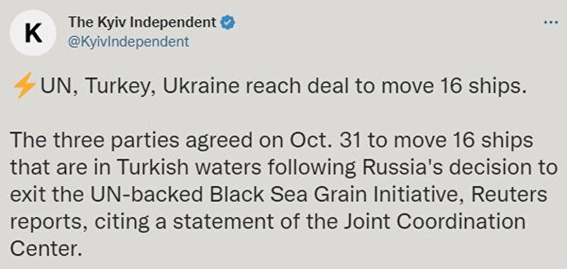Rusya'nın BM destekli Karadeniz Tahıl Girişimi'nden çıkma kararının ardından Ankara, Kiev ve BM'nin 31 Ekim'de Türk karasularında bulunan 16 gemiyi hareket ettirme konusunda anlaştığı ifade edildi.