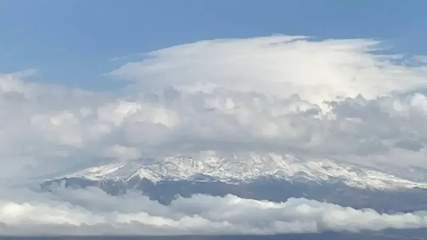 Büyük bir bölümü beyaza bürünen Ağrı Dağı, zirvesi ve çevresini saran bulutlarla güzel manzara oluşturdu.