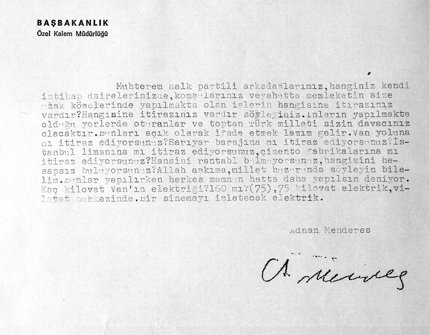 Başbakanlık arşivlerinden çıkan bir belge de Menderes’in, CHP’ye isyanını ortaya koydu. Yeni Şafak’ın ulaştığı belgede Menderes CHP’lilere böyle sesleniyor: “Muhterem Halk Partili arkadaşlarımız, hanginiz kendi intihap dairelerinizde, komşularınız veyahut da memleketin size uzak köşelerinde yapılmakta olan işlerin hangisine itirazınız vardır? Hangisine itirazınız vardır söyleyiniz. Bunların yapılmakta olduğu yerlerde oturanlar ve toptan Türk milleti sizin davacınız olacaktır. Bunları açık olarak ifade etmek lazım gelir. Van yoluna mı itiraz ediyorsunuz? İstanbul limanına mı itiraz ediyorsunuz? Çimento fabrikalarına mı itiraz ediyorsunuz? Hangisini rantabl bulmuyorsunuz, hangisini hesapsız buluyorsunuz? Allah aşkına, millet huzurunda söyleyin bilelim. Bunlar yapılırken herkes memnun hatta yapılsın deniyor….”