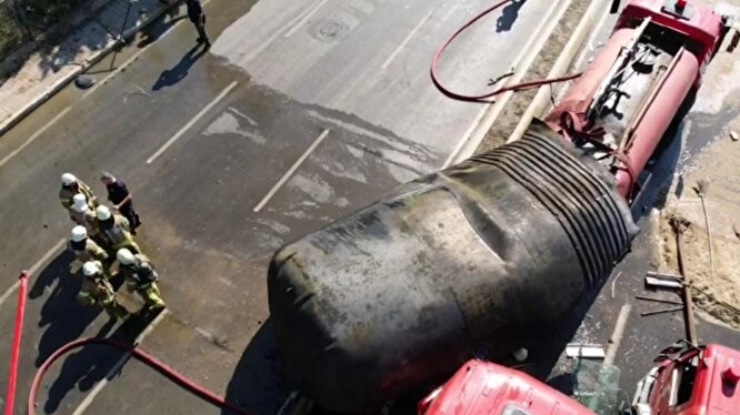 Zaman zaman patlamaların da yaşandığı yangının sıçraması nedeniyle alev alan itfaiye aracındaki yangın da ekiplerin müdahalesiyle söndürüldü.