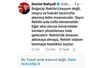 MHP Genel Başkanı Devlet Bahçeli'nin Boğaziçi Üniversitesindeki protestolara ilişkin sosyal medya hesabından yaptığı bazı paylaşımlara, Twitter tarafından kısıtlama getirildiği bildirildi.