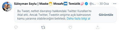 Twitter, “4 LGBT sapkını” söylemi nedeniyle Bakan Soylu’nun tweetini kısıtladı. Paylaşıma, “Bu Tweet, nefret davranışı hakkındaki Twitter Kuralları'nı ihlal etti. Ancak Twitter, tweetin erişime açık kalmasının kamu yararına olabileceğini belirledi” notu düşüldü.