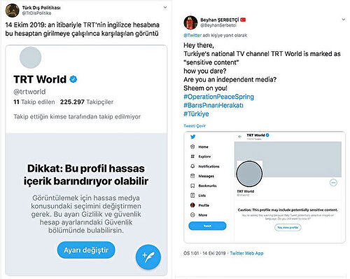 Barış Pınarı Harekatının başlamasının ardından sosyal medyada teröre örgütünün kara propagandasına karşı bireysel ve kurumsal hesaplardan Türk kullanıcılar operasyona ilişkin doğru bilgiler verilmeye başladı. Twitter ilk etapta Türkiye’deki operasyona ilişkin yayın yapan etkili hesapları engelledi. Bir diğer grişim ise içeriklerin hassas olduğu gerekçesi ile uyarı verilmesi oldu.