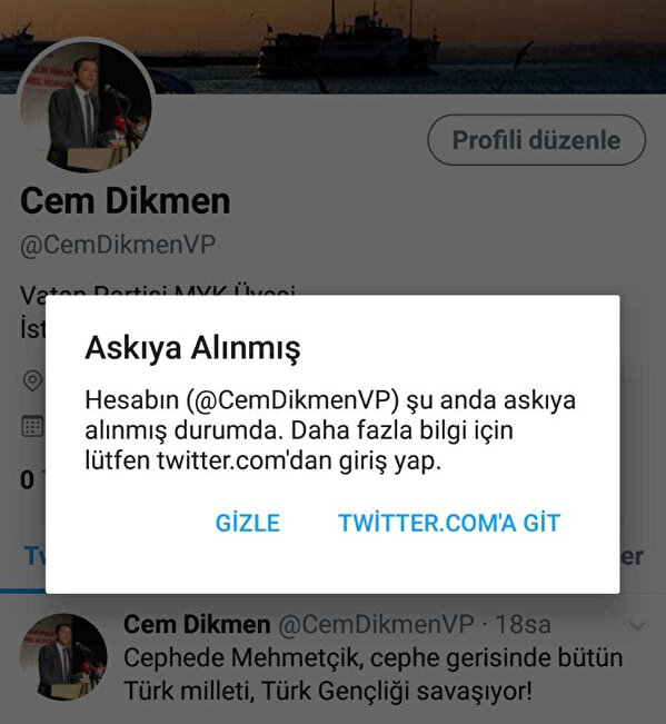 - Geçen hafta Genel Başkanımız Sayın Doğu Perinçek’in “mahfolursun Trump” teewitinden sora da Genel Başkanımızın hesabı askıya alınmıştı. İtirazlarımız ve mücadelemiz sonucu açmak zorunda kaldılar.