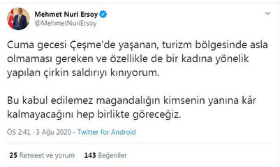 Kültür ve Turizm Bakanı Mehmet Nuri Ersoy ise İzmir'in Çeşme ilçesinde yaşanan darp olayını kınayarak "Bu kabul edilemez magandalığın, kimsenin yanına kar kalmayacağını hep birlikte göreceğiz" ifadesini kullandı.