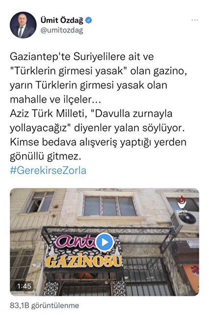 Zafer Partisi Genel Başkanı Ümit Özdağ dün Gaziantep'te bulunan bir gazino hakkında, "Suriyelilere ait, Türkler giremiyor" paylaşımında bulunmuştu. Özdağ, iddia ettiği işletmenin sahibinin Türk çıkması sonrası paylaşımını sildi. Ümit Özdağ, gerçek olmayan ifadeleri hakkında herhangi bir tekzip veya açıklama henüz yayınlamadı.