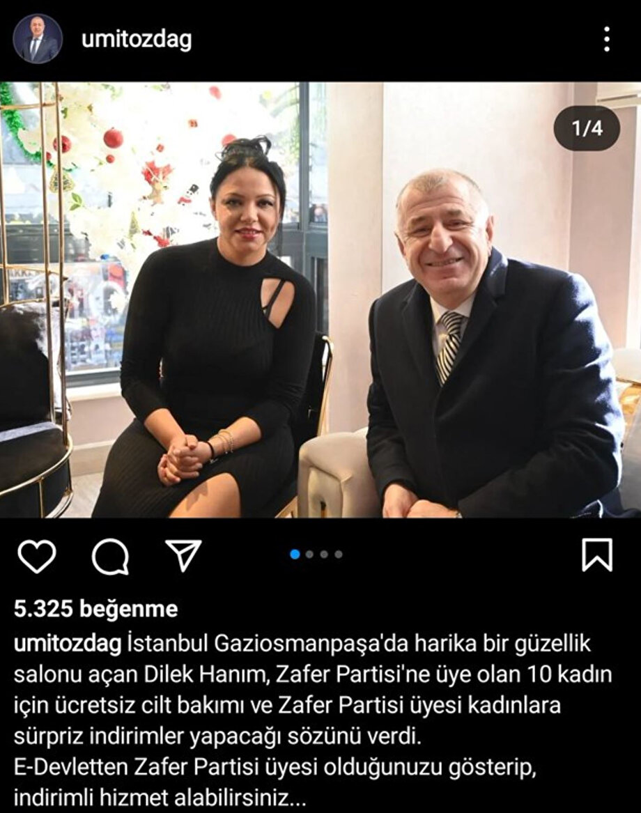 "İstanbul Gaziosmanpaşa'da harika bir güzellik salonu açan Dilek Hanım, Zafer Partisi'ne üye olan 10 kadın için ücretsiz cilt bakımı ve Zafer Partisi üyesi kadınlara sürpriz indirimler yapacağının sözünü verdi. e-Devletten Zafer Partisi üyesi olduğunuzu gösterip, indirimli hizmet alabilirsiniz."