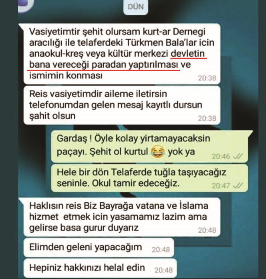 Şehidin vasiyetiyle ilgili bir açıklama da Irak Türkmen Cephesi Başkanı Erşat Salihi’den geldi. Salihi “Unutma ki şehidim bu vasiyetin gerçekleşecektir. Telafer’de senin adına bir anaokulu açacağız” ifadelerine yer verdi.
