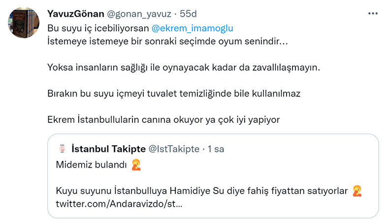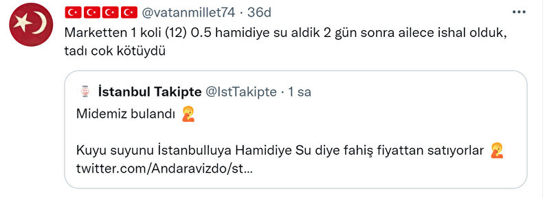 Geçtiğimiz yıl vatandaşa kuyu suyu sattığı ortaya çıkan İBB'ye ait Hamidiye AŞ'nin damacanasının içindeki suyun rengi sosyal medyada gündem oldu. Hamidiye damacanalarının fotoğrafını paylaşan bir sosyal medya kullanıcısı paylaşımına, "Bilin bakalım bu suyun markası ne?" notunu düştü. Hamidiye'nin yeşil renkli suyu sosyal medyada tepkilere neden oldu.