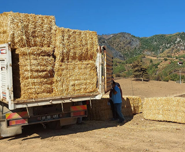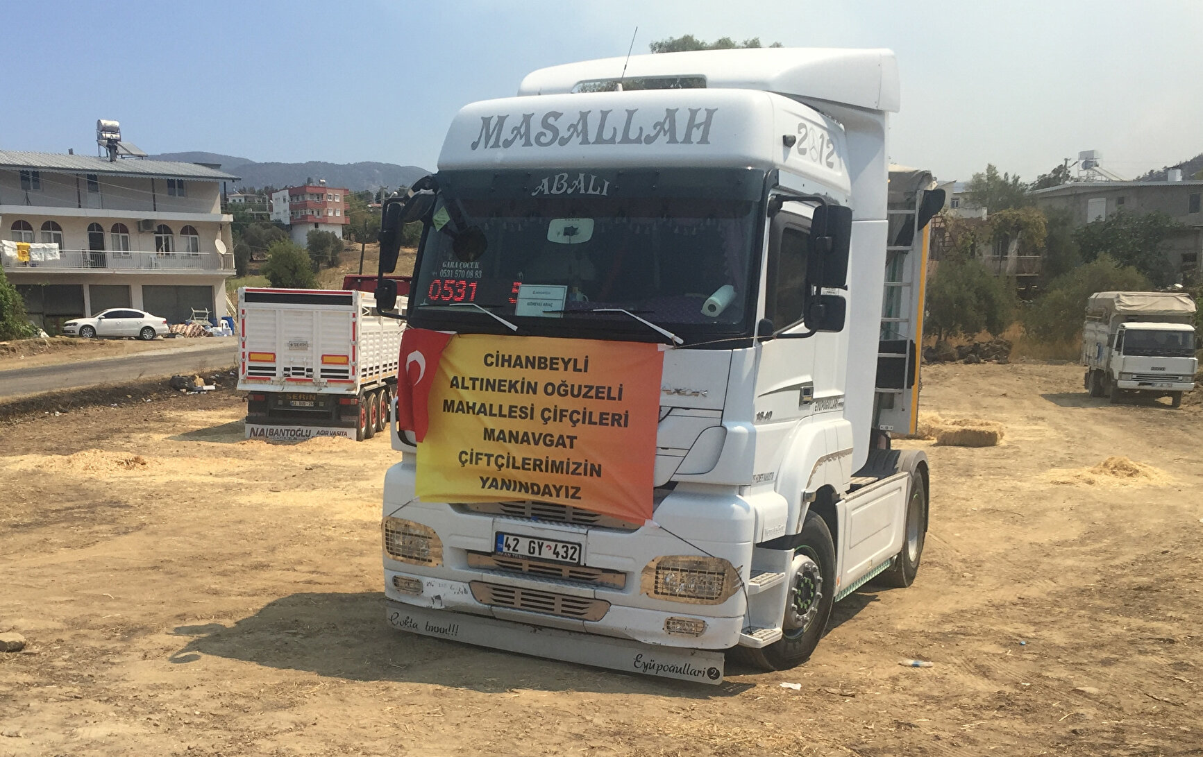 Antalya'nın Manavgat ilçesindeki orman yangınında hayvanları zarar gören ve yem sıkıntısı çeken besiciler için Konya başta olmak üzere çok sayıda ilden gönderilen tırlar dolusu saman ve kesif yem dağıtılıyor.