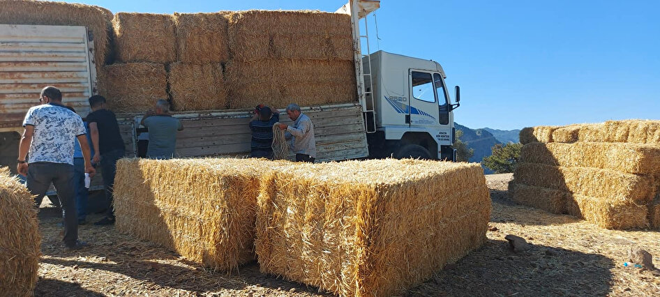 Antalya'nın Manavgat ilçesindeki orman yangınında hayvanlarının yemleri yanan bölgedeki besiciler için 4 günde hayırseverlerin topladığı 300 tır dolusu saman ve kesif yemin dağıtımı devam ediyor.