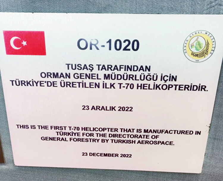 Helikopterin içinde “TUSAŞ tarafından Orman Genel Müdürlüğü için Türkiye’de üretilen ilk T-70 helikopteridir” levhası dikkat çekiyor. T-70’in dışında Türkiye’de TUSAŞ tarafından üretilen Gökbey helikopteri de ilerleyen yıllarda Orman Genel Müdürlüğü’nün envanterine dahil edilecek.