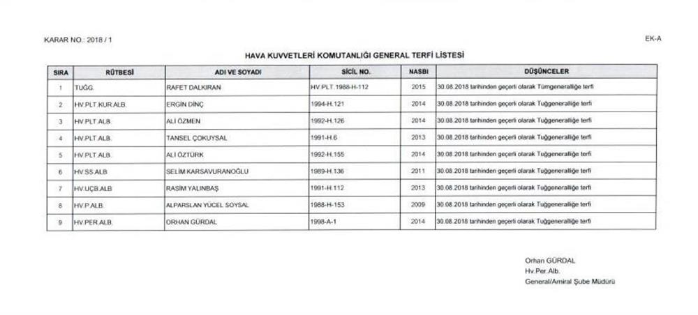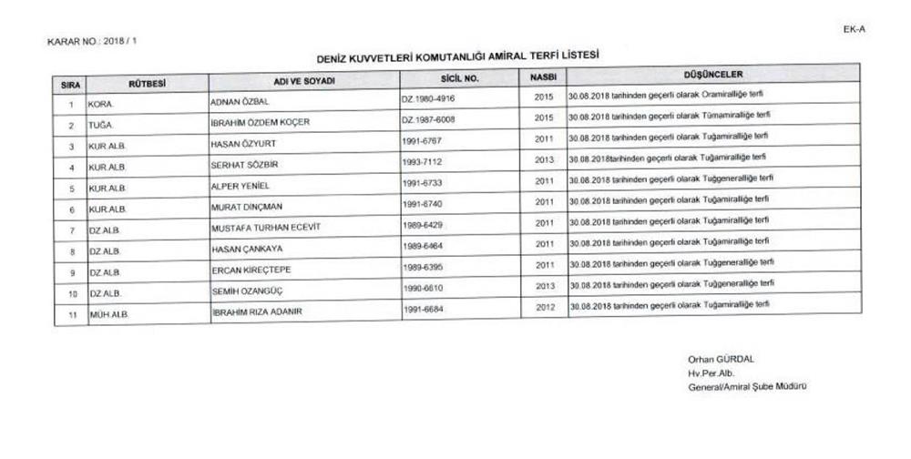 12 general/amiral kadrosuzluktan emekliye sevk edilmiştir. 215 olan general/amiral sayısı 244 olacaktır. Deniz Kuvvetleri Komutanı Koramiral Adnan Özbal oramiralliğe, 2. Ordu Komutanı Korgeneral İsmail Metin Temel orgeneralliğe, tümgeneral Kemal Yeni ve tümgeneral Sinan Yayla korgeneralliğe, tuğgeneral Levent Ergün tuğgeneral Mustafa Oğuz, tuğgeneral Ahmet Ercan Çorbacı tümgeneralliğe, İbrahim Özdem Koçer tümamiralliğe, Rafet Dalkıran tümgeneralliğe terfi ettirildi.