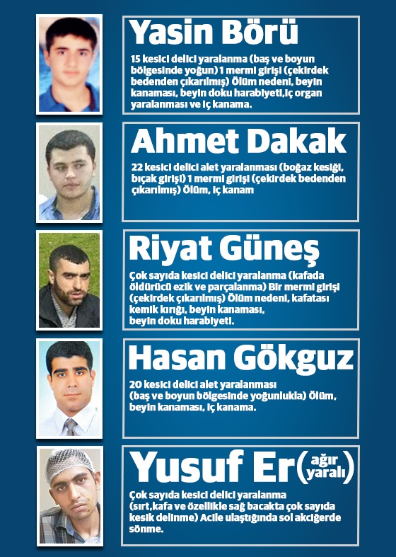 Vahşet, öldürülen 4 gencin otopsi yaralı kurtulan Yusuf Er'in Adli Tıp raporlarına da yansımış durumda. Raporlara göre öldürülen gençlere çok ağır işkenceler yapılmış. Ahmet Dakak'ta 22, Hasan Gökguz'da 20, Yasin Börü'de 15 bıçak darbesi var. Riyat Güneş'in ise kafatası kemiği kırılmış. Hasan Gökguz hariç öldürülen gençlerin vücutlarında birer tane de kurşun izine rastlandı.