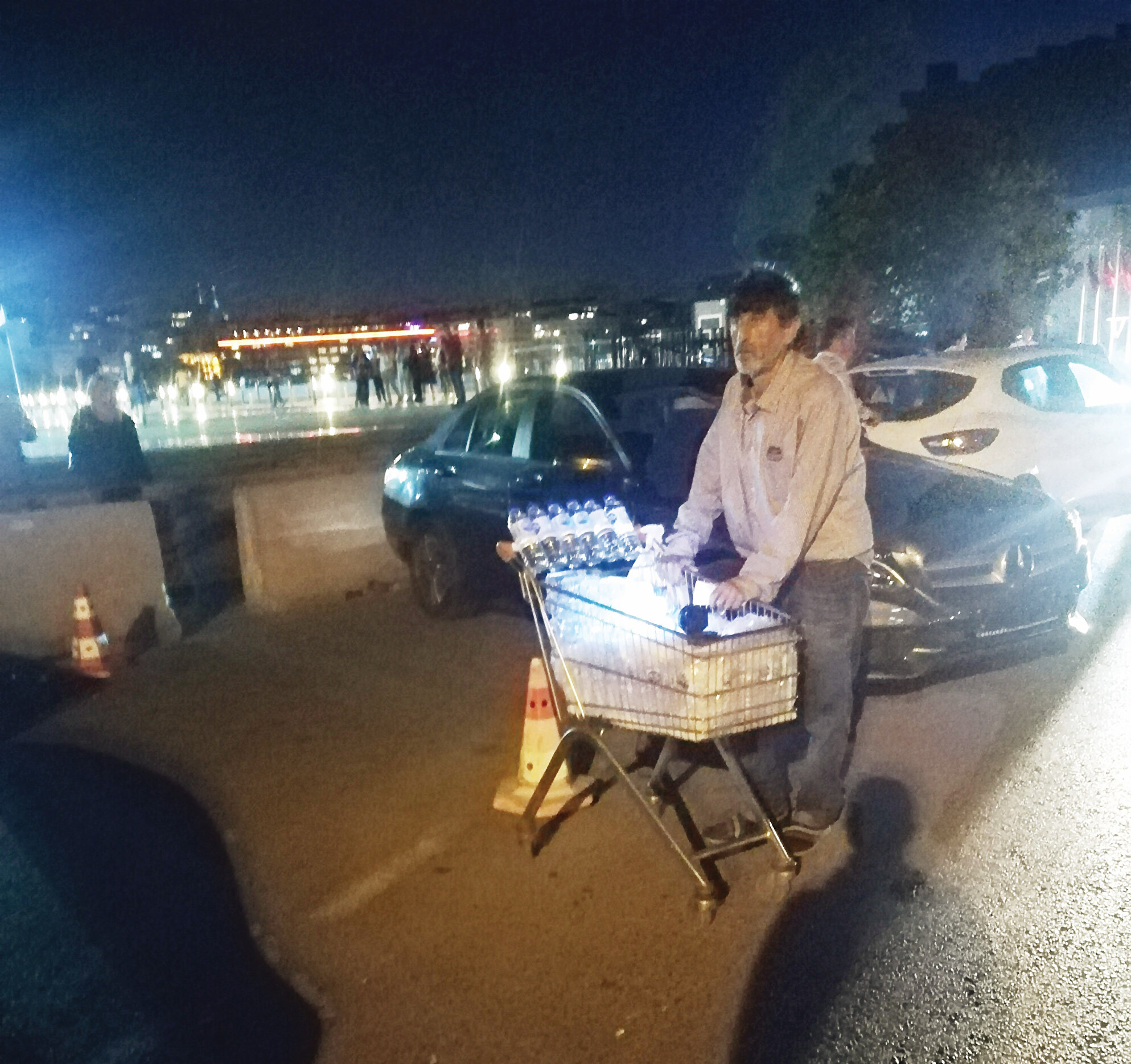 Harbiye Orduevi tarafından alana gitmek isteyenleri önce su satıcıları karşılıyor. Yerleri oldukça stratejik, içeriye yiyecek ve içecek ile girmek yasak olduğu için izleyicileri ilk onlar yönlendiriyor. TRT Radyosu tarafında bekleyen sucu, bir gecede 100 adetlik ciro yaptığını söylüyor. “İçeride 3 lira vermek yerine benden 1 liraya alıyor” diyen satıcı haftada en az 4 gün olan konserler sayesinde günlük kazançların 100 lirayı aştığını paylaşıyor. Buraya daha kestirme giriş varken, gelenleri biraz daha uzun yürüten diğer yere yönlendirdiğini görüyoruz, sebebini zorla da olsa itiraf ediyor: “Amaç diğer satıcıların olduğu alana geçmelerini sağlamak.”